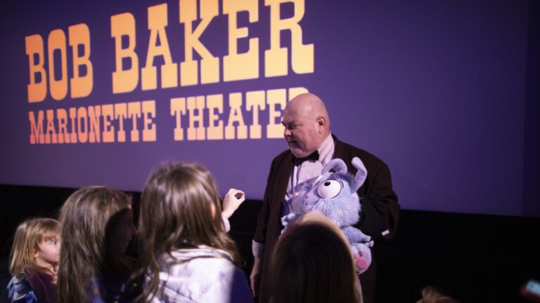 Performers with the Bob Baker Marionette Theater gesture to the crowd of families at Vidiots, a historic theater in northeast Los Angeles, a few miles from where fires are still burning in the Altadena and Pasadena neighborhoods. Ryan Kellman/NPR hide…