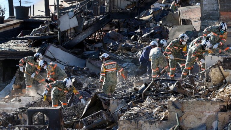 An urban search and rescue team from Mexico combs through the ruins of a beachfront house searching for victims in the aftermath of the Palisades Fire in Malibu, Calif., on Tuesday. Valerie Macon/AFP via Getty Images hide caption toggle caption…