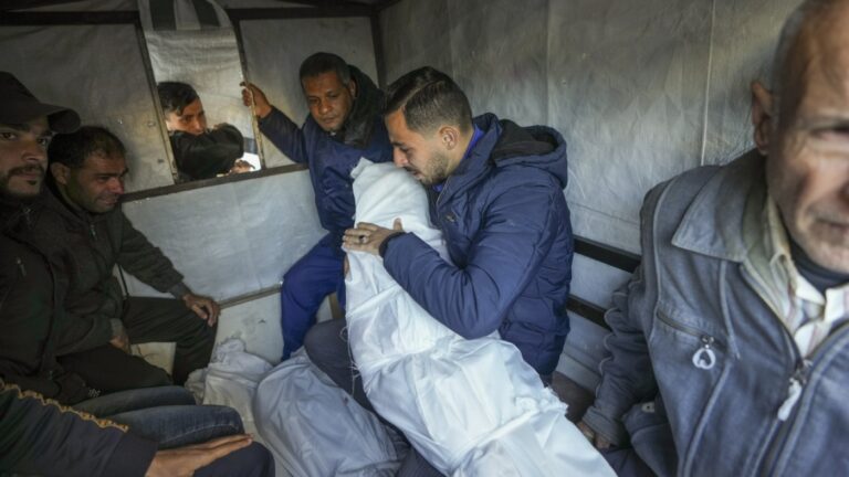 Mohammad Eid carries the body of one of his three relatives killed on Saturday in an Israeli airstrike, as they are prepared for the funeral in Deir al-Balah, central Gaza Strip, Sunday, Jan. 12, 2025. (AP Photo/Abdel Kareem Hana) Abdel…