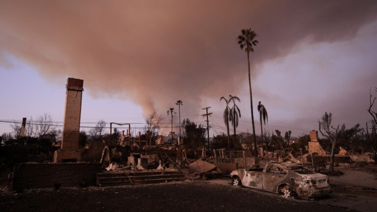 Flames from the Palisades Fire burn a building on Sunset Boulevard amid a powerful windstorm on January 8, 2025 in the Pacific Palisades neighborhood of Los Angeles, California. Lokman Vural Elibol/Anadolu via Getty Images hide caption toggle caption Lokman Vural…