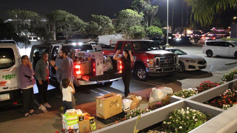 Lauren Gruel, pictured at right, celebrates having filled another truck bed with community-donated supplies on Thursday. She and her husband Andrew turned their Huntington Beach restaurant into a donation hub to support wildfire victims in Los Angeles. Emma Bowman/NPR hide…