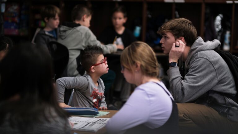 Kellen Hedler’s classroom aid, Parker Van Buskirk, checks in with Kellen as he works on an assignment. Kellen is largely independent throughout the school day, but Van Buskirk is available in case he needs help. Katrina Ward for NPR hide…
