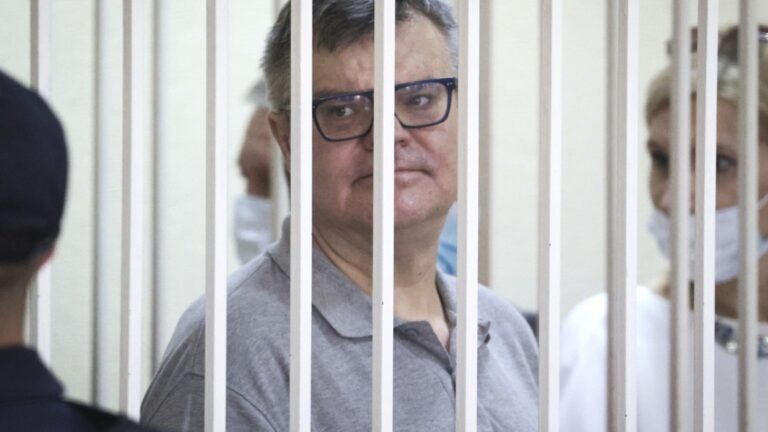 Viktar Babaryka, a former presidential hopeful, stands inside a defendants’ cage during his trial in Minsk, Belarus, on July 6, 2021. Ramil Nasibulin/AP/Pool BelTa hide caption toggle caption Ramil Nasibulin/AP/Pool BelTa TALLINN, Estonia — An imprisoned opposition activist in Belarus…