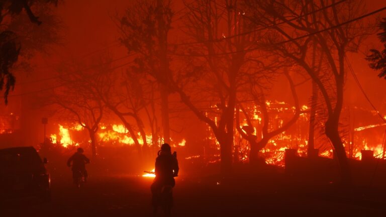 Two persons ride by on motorcycles as the Palisades Fire destroys a neighborhood in the Pacific Palisades neighborhood of Los Angeles on Tuesday, Jan. 7, 2025. Etienne Laurent/AP hide caption toggle caption Etienne Laurent/AP More than 4,000 acres of land…