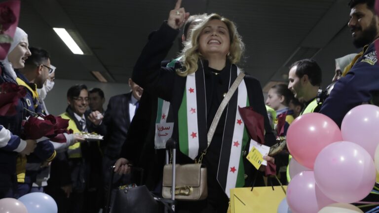 A Syrian woman who arrived at a first international commercial flight since the fall of former Syrian President Bashar Assad shouts anti-Assad slogans at the arrival terminal of Damascus international airport, in Damascus, Syria on Tuesday. Omar Sanadiki/AP hide caption…