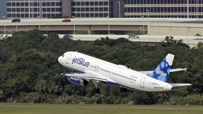 A JetBlue Airways Airbus A320-232 takes off from the Tampa International Airport in Florida on May 15, 2014. Two bodies were found in the landing gear compartment of a JetBlue plane at Fort Lauderdale-Hollywood International Airport on Monday night, the…