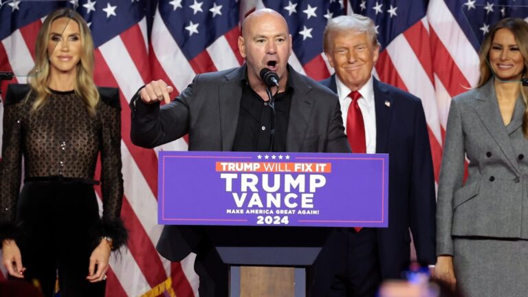 Ultimate Fighting Championship CEO Dana White speaks at an election night event for President-elect Donald Trump West Palm Beach, Florida on Nov. 6. Facebook and Instagram parent company Meta has named White to its board of directors. Win McNamee/Getty Images…