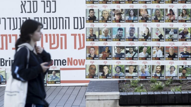 A woman passes a wall on Monday in Kfar Saba, Israel, covered with photos of hostages kidnapped to the Gaza Strip during the Oct. 7, 2023, Hamas-led attack. Amir Levy/Getty Images/Getty Images Europe hide caption toggle caption Amir Levy/Getty Images/Getty…