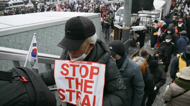 A supporter of impeached South Korean President Yoon Suk Yeol holds a placard reading “Stop the Steal” as he takes part in a rally near Yoon’s residence in Seoul on Sunday. Anthony Wallace/AFP via Getty Images hide caption toggle caption…