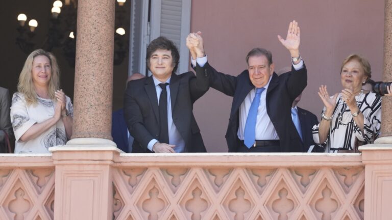 Venezuela’s opposition leader Edmundo Gonzalez Urrutia, center right, and Argentine President Javier Milei hold hands from the government house balcony in Buenos Aires, Argentina, Saturday, Jan. 4, 2025. Natacha Pisarenko/AP hide caption toggle caption Natacha Pisarenko/AP BUENOS AIRES, Argentina —…