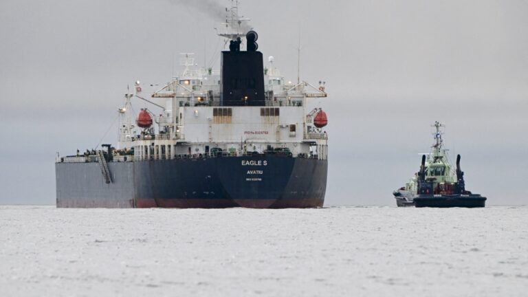 On Saturday off Porkkalanniemi, Kirkkonummi, in the Gulf of Finland, oil tanker Eagle S (L), which flies under the flag of the Cook Islands, next to tugboat Ukko (R). Jussi Nukari/Lehtikuva/AFP via Getty Images hide caption toggle caption Jussi Nukari/Lehtikuva/AFP…