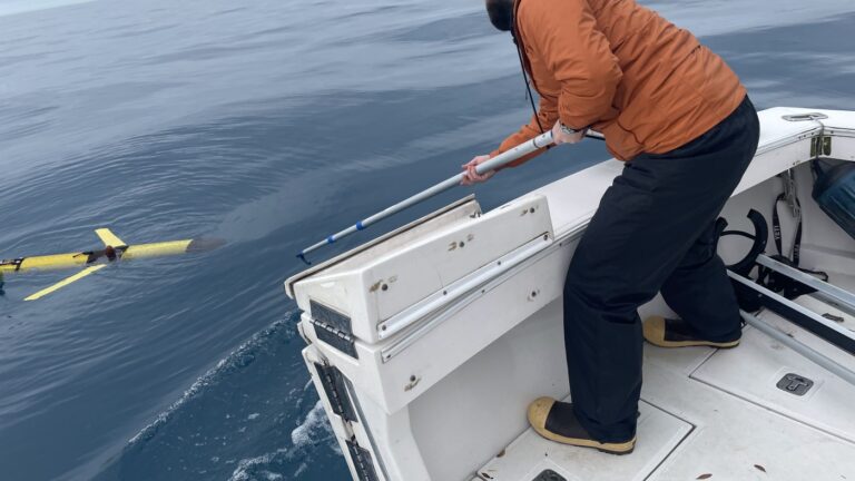 A Teledyne G3 Slocum Glider looks for whale sounds off the coast of Georgia. UGA Skidaway Institute doctoral student Frank McQuarrie is taking it out of the water. Catherine Edwards Lab/SKidaway Institute hide caption toggle caption Catherine Edwards Lab/SKidaway Institute…