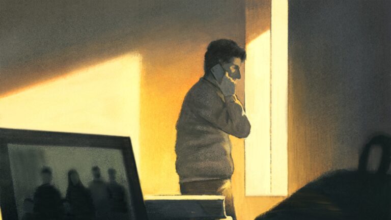 BH talking to his family through the phone in the background and photos of the family in the foreground. Hokyoung Kim for NPR hide caption toggle caption Hokyoung Kim for NPR ALEXANDRIA, VA. – Shafi Amani wears a bright red…