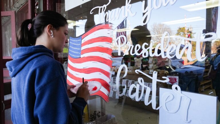 Morgan Minick paints a sign thanking former President Jimmy Carter in his hometown after he died Sunday in Plains, Ga. President Carter lived to be 100 years old, making him the longest living U.S. president in history. Megan Varner/Getty Images…