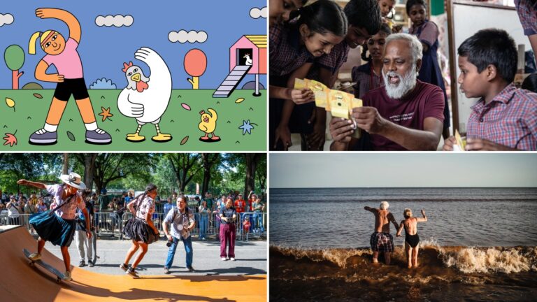 Clockwise from upper left: Chicken-sizing will keep you fit. Educator Mo Pandiarajan excitedly shows his students a view of the specimen in a foldscope — a microscope made of paper. Bolivian skateboarders show off their moves at the Smithsonian Folklife…
