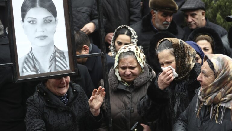 People mourn at the grave of flight attendant Hokume Aliyeva during a funeral of the crew members of the Azerbaijan Airlines Embraer 190 killed in a deadly plane crash in Kazakhstan this week, at the II Alley of Honor in…