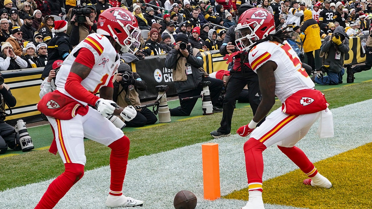 Kansas City Chiefs wide receiver Xavier Worthy (1) celebrates his touchdown with Hollywood Brown (5) during the first half against the Pittsburgh Steelers, Wednesday, Dec. 25, 2024, in Pittsburgh. (AP Photo/Matt Freed)