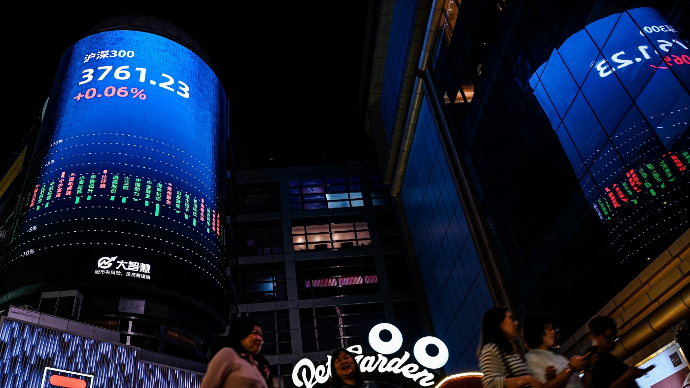People walk past a screen showing the CSI 300 Index at a shopping mall in Guangzhou, in southern China’s Guangdong province.