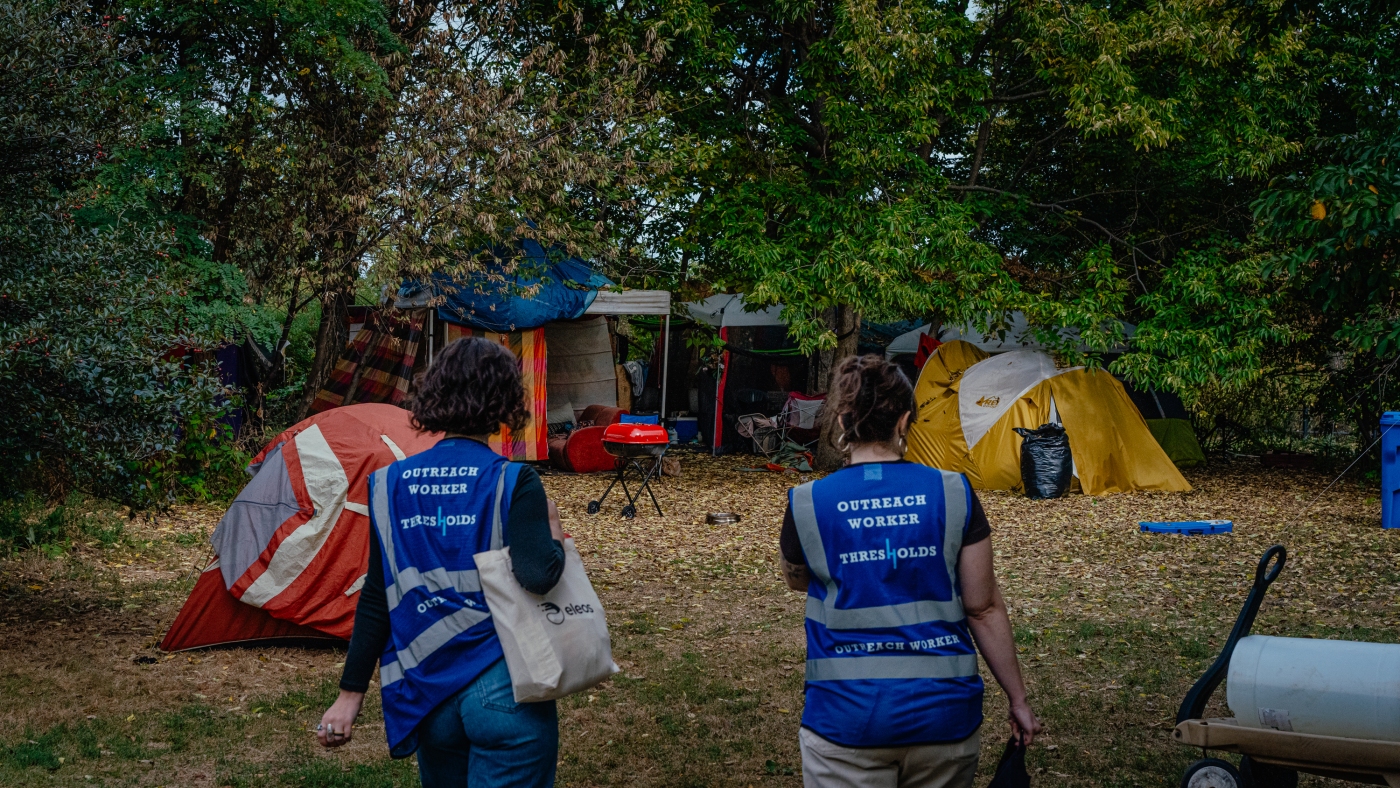 The burst of new laws follows a landmark U.S. Supreme Court ruling, and reflects public frustration with record-high homelessness. Outreach workers Lillian Risser (left) and Sophia Loveland (right) approach a tent encampment in Chicago, Ill. on Sept. 23, 2024. The organization is working to rehome people living in encampments to more permanent housing.