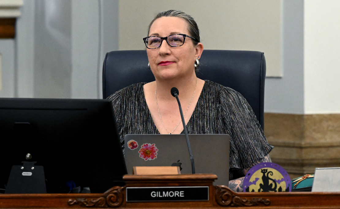 Member of the City Council of Denver Stacie Gilmore, eleven in the district, is sitting in her place in the chambers of the City Council in the City and County Building in Denver, Colorado, July 17, 2023.