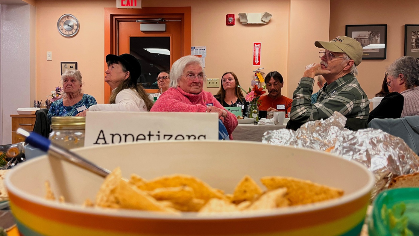 As I mill around talking to guests, a woman named June Howard is eager to tell me what she has brought to share tonight. (Spoiler: It’s a casserole.) She says, “It’s got cubed-up chicken. It’s got carrots, celery, onions, cheese, apples, cranberries …”