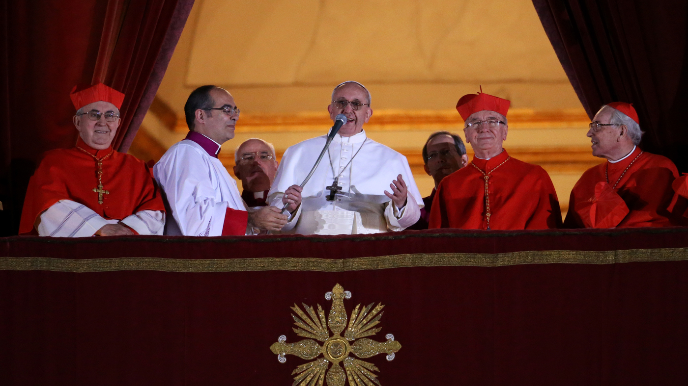 Newly elected Pope Francis I speaks to the waiting crowd from the central balcony of St Peter’s Basilica in March 2013 in Vatican City, Vatican.