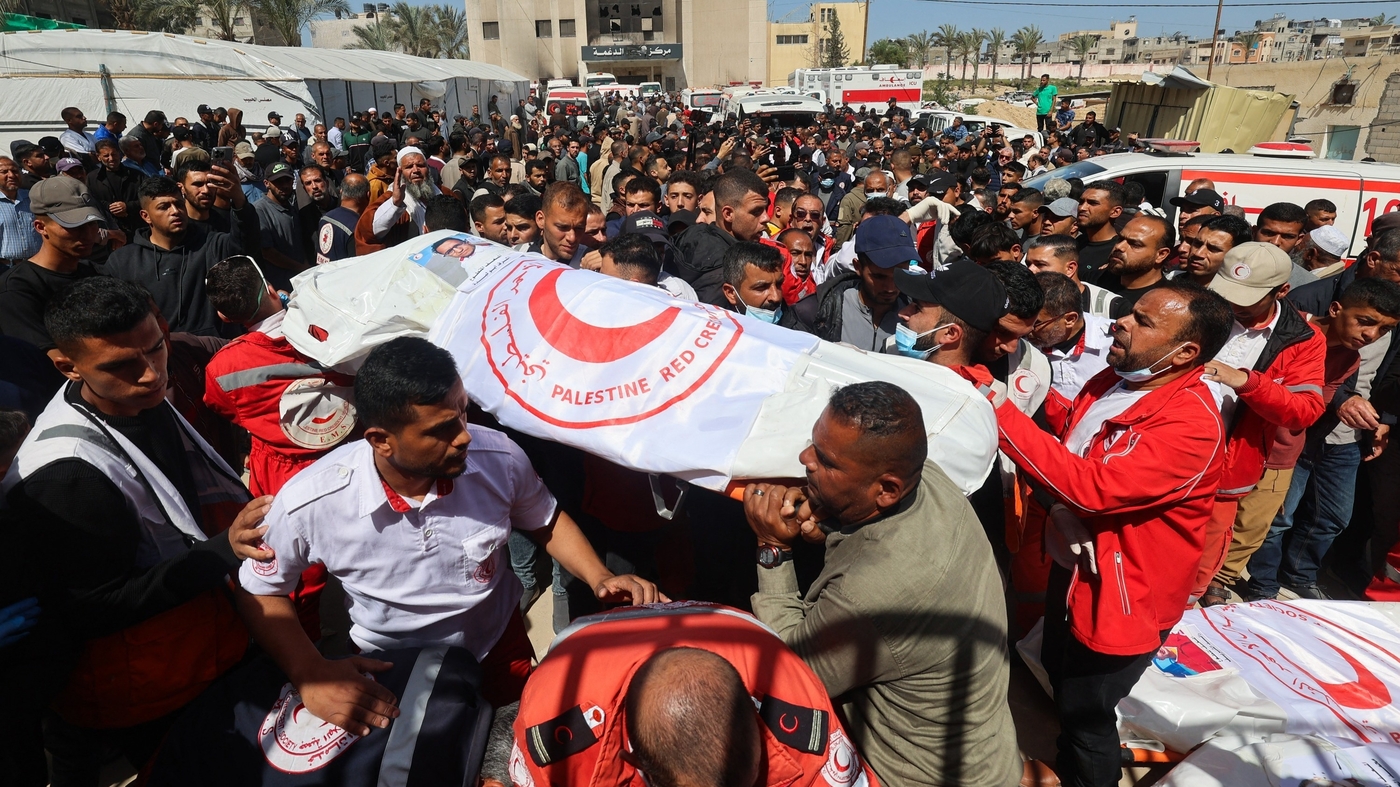 Members of the Palestine Red Crescent and other emergency services carry bodies of fellow rescuers killed a week earlier by Israeli forces, during a funeral procession at Nasser hospital in Khan Yunis in the southern Gaza Strip on March 31.