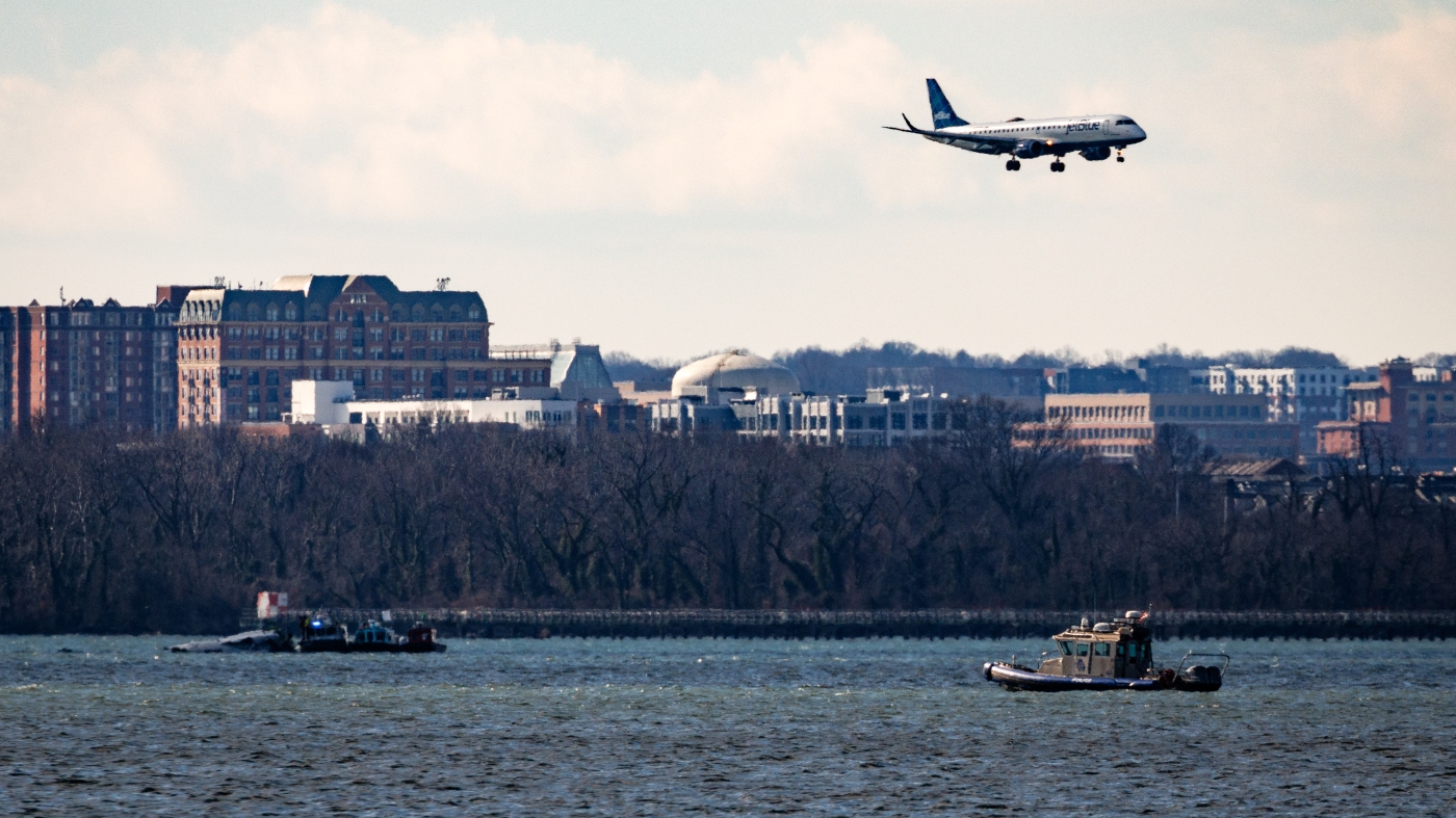 A flight flies over law enforcement boats and the partially submerged fuselage of American Airlines Flight 5342 in the Potomac River on Saturday in Washington, D.C.