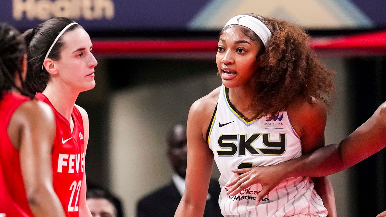 Caitlin Clark, 22, of Indiana Fever and Angel Reese (5) from Chicago Sky during the June 1, 2024 match at Gainbridge Fieldhouse in Indianapolis. (Jeff Haynes/Nbae via Getty Images)