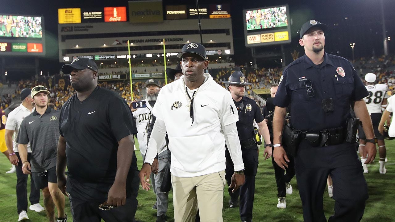 University of Colorado Buffs head coach Deion Sanders walks off the field with his security detail after the University of Colorado Buffs beat the Arizona State Sun Devils at Mountain America Stadium on October 7, 2023 in Tempe, Arizona. (Bruce Yeung/Getty Images)