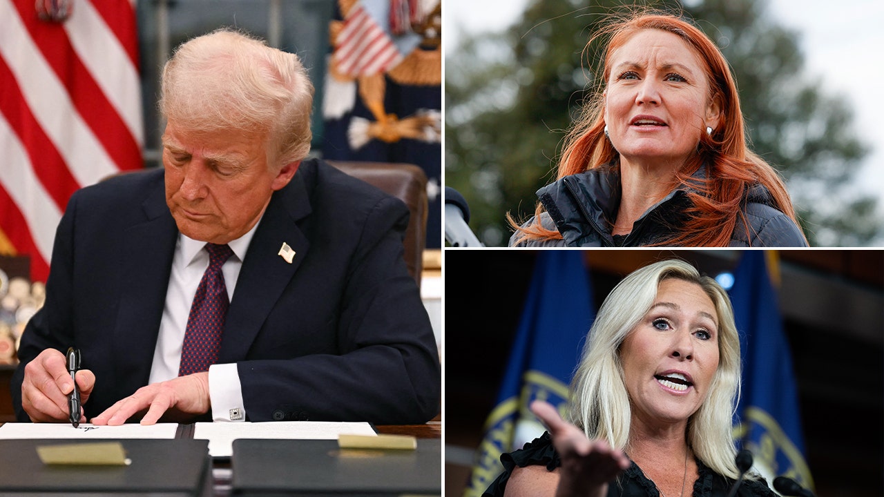 Trump signs executive order, Rep. Marjorie Taylor and Greene Rep. Melanie Stansbury. (Jim Watson/POOL/AFP via Getty Images, left, Tom Williams/CQ-Roll Call, Inc via Getty Images, top right, Jemal Countess/Getty Images for the Congressional Integrity Project, bottom right.)