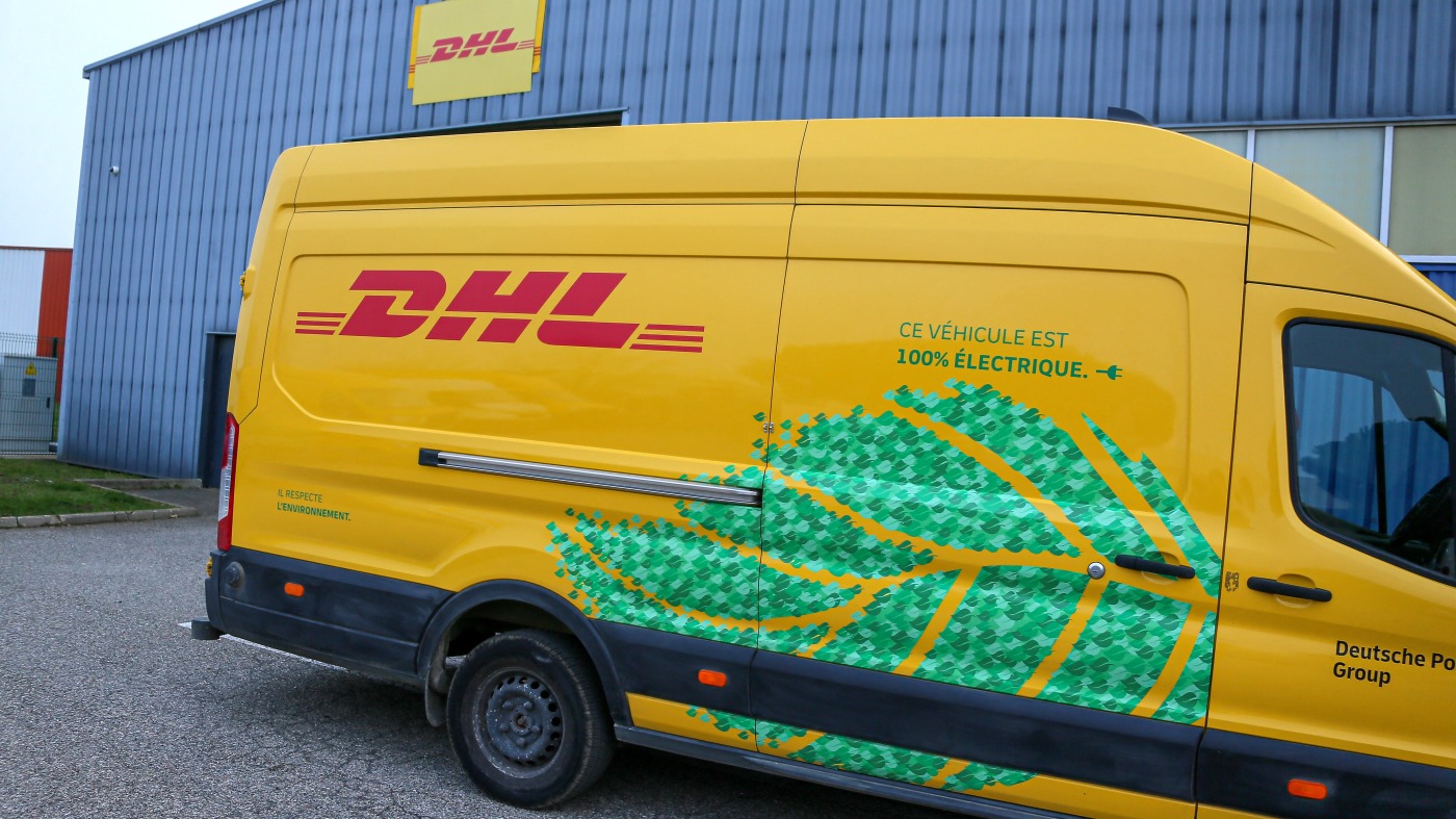 A DHL delivery vehicle is seen in front of a warehouse in Valence, France, in December 2024. The global shipping company announced it would temporarily stop shipping packages valued over $800 to U.S. consumers.