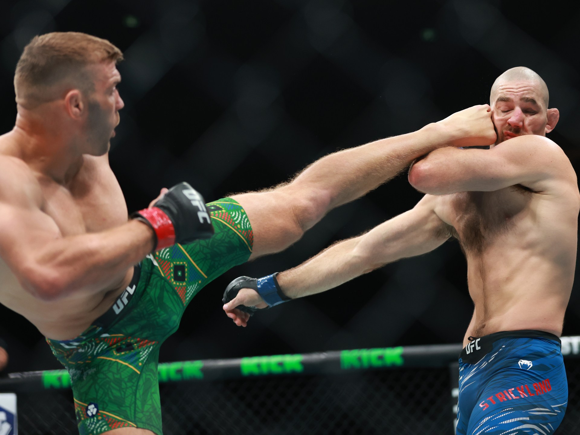 In a measured start, he utilized his favored head kicks, landing four in round one as strickland responded with tentative jabs.