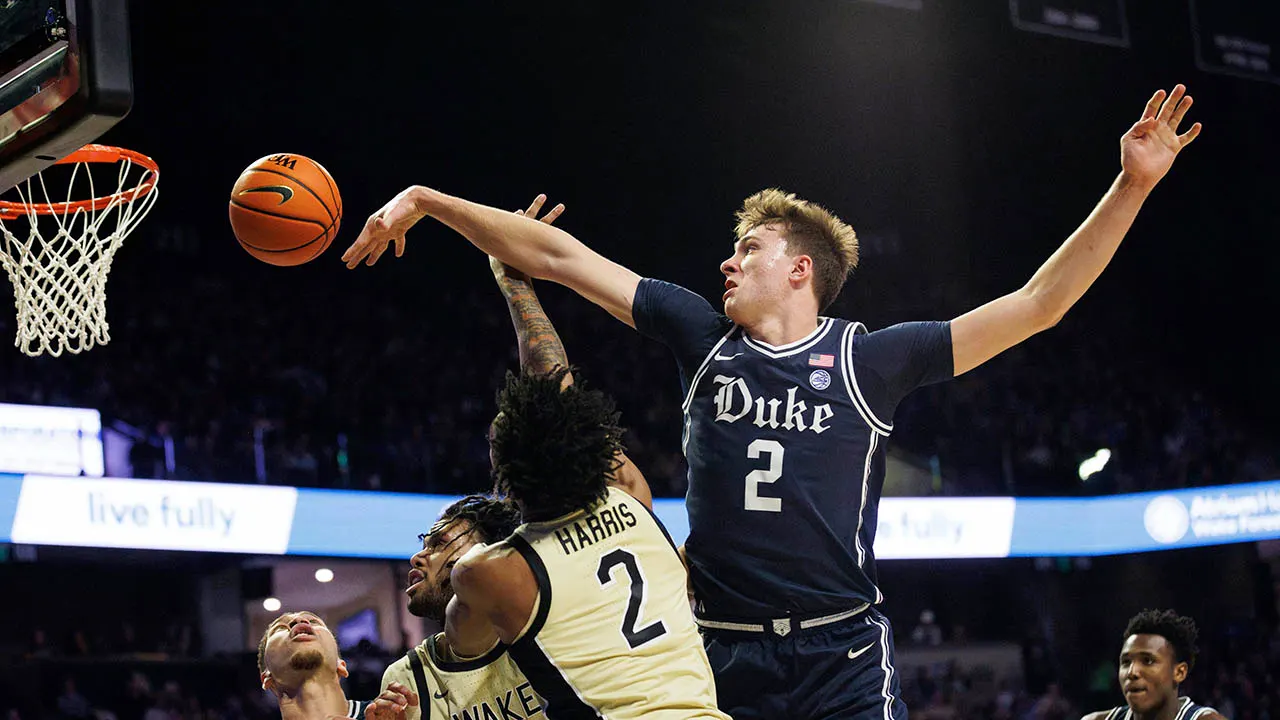 Duke’s Cooper Flagg blocks the shot of Juke Harris Wake Forest in Winston-Salem, North Carolina, Saturday, January 25, 2025. (AP Photo/Ben McKeown)