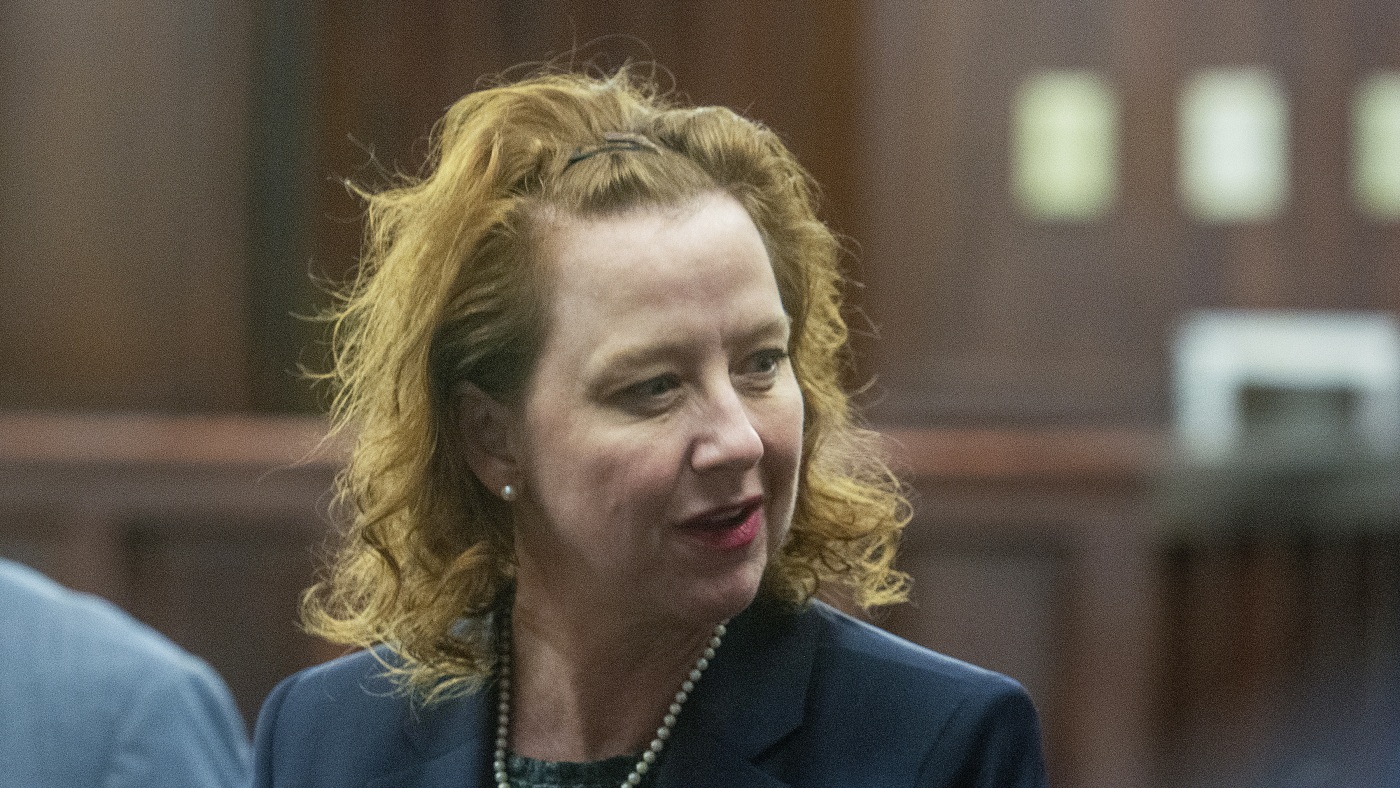 Former District Attorney Jackie Johnson speaks at the Glynn County Courthouse in Brunswick, Ga. last month. She goes on trial Monday for interfering with the police investigation into the shooting death of Ahmaud Arbery, the Black jogger chased and killed by three white men in February 2020. No arrests were made until months later, and only after video of the crime came out.