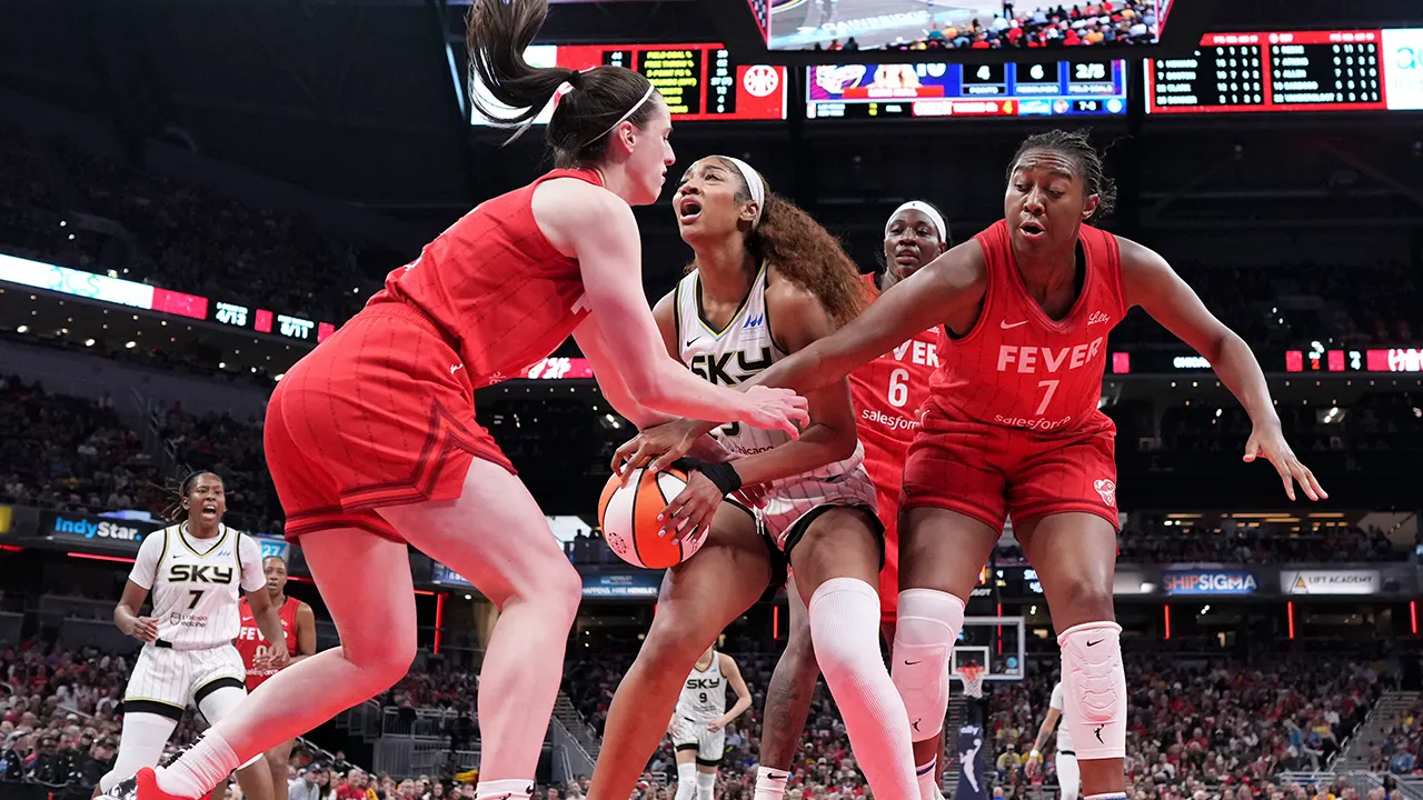 Indiane Caitlin Clark fever, left, a misdemeanor of Chicago Sky striker Angel Reese, in the center, during the second half of the WNBA basketball game in Indianapolis, on Saturday, May 17, 2025. (AP Photo/aj fat)