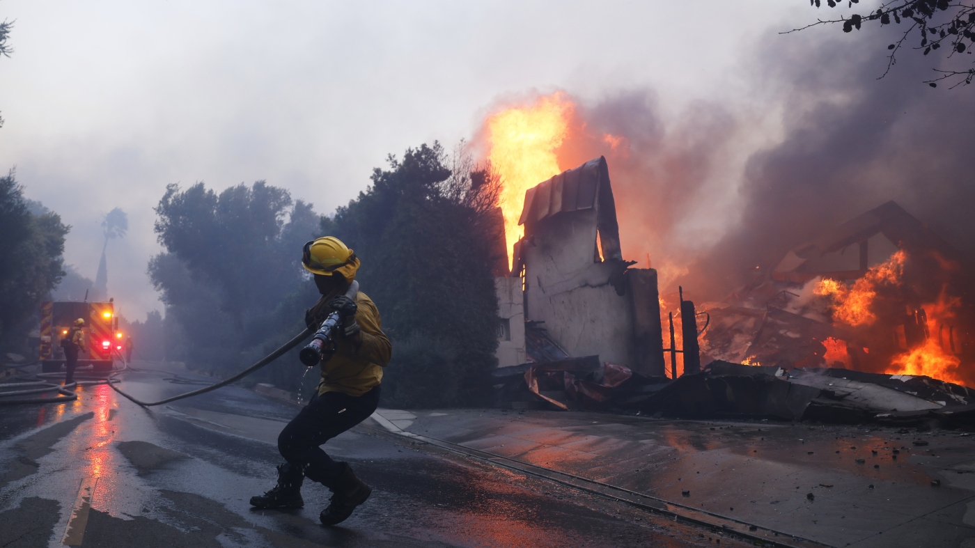 A firefighter battles the advancing Palisades Fire as it burns a structure in the Pacific Palisades neighborhood of Los Angeles on Tuesday.