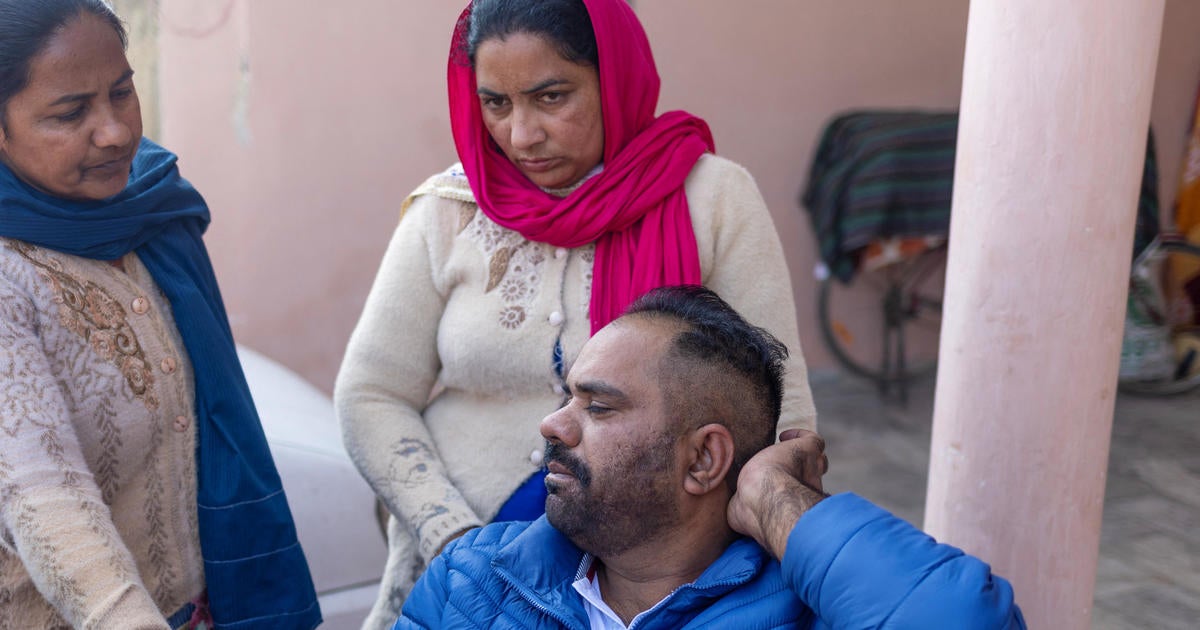Charanjeet Kaur, 30, stands behind her husband Daler Singh, 37, who was among dozens of Indian nationals deported by U.S. authorities back to India on a U.S. military plane, allegedly in handcuffs and leg chains, at his house in the village of Salempura, Amritsar, India, Feb. 6, 2025.