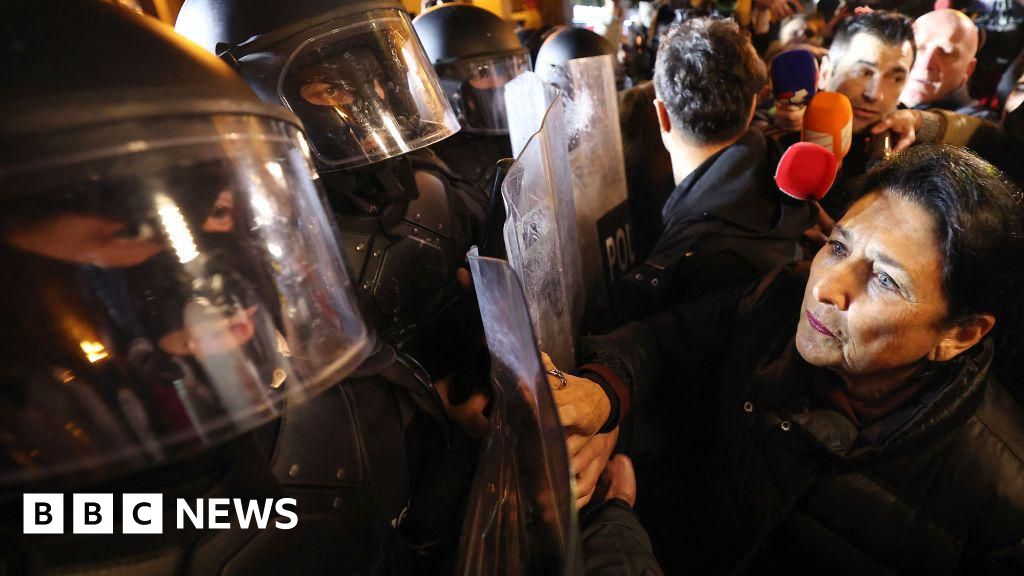 Getty Images Salome Zourabichvili confronts a group of undercover police. Riot police are wearing riot helmets and holding riot shields. The crowd surrounds the president. Getty Images