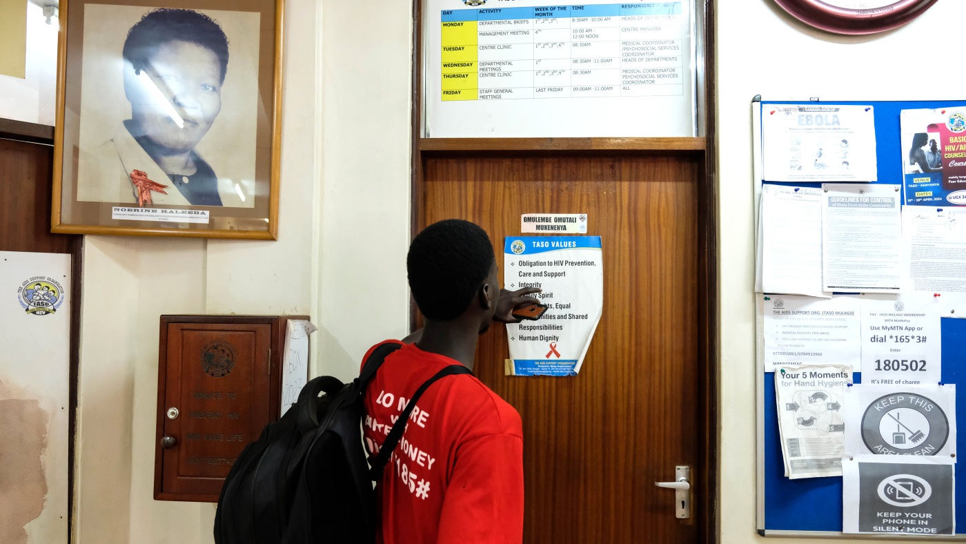 A man reads a poster in the office of The AIDS Support Organization in Kampala, Uganda. Half the group’s funding is from the United States Agency for International Development (USAID). The Trump administration froze virtually all foreign aid funds for 90 days, then issued a waiver for life-saving activities. Now a judge has ordered a temporary halt to the freeze.
