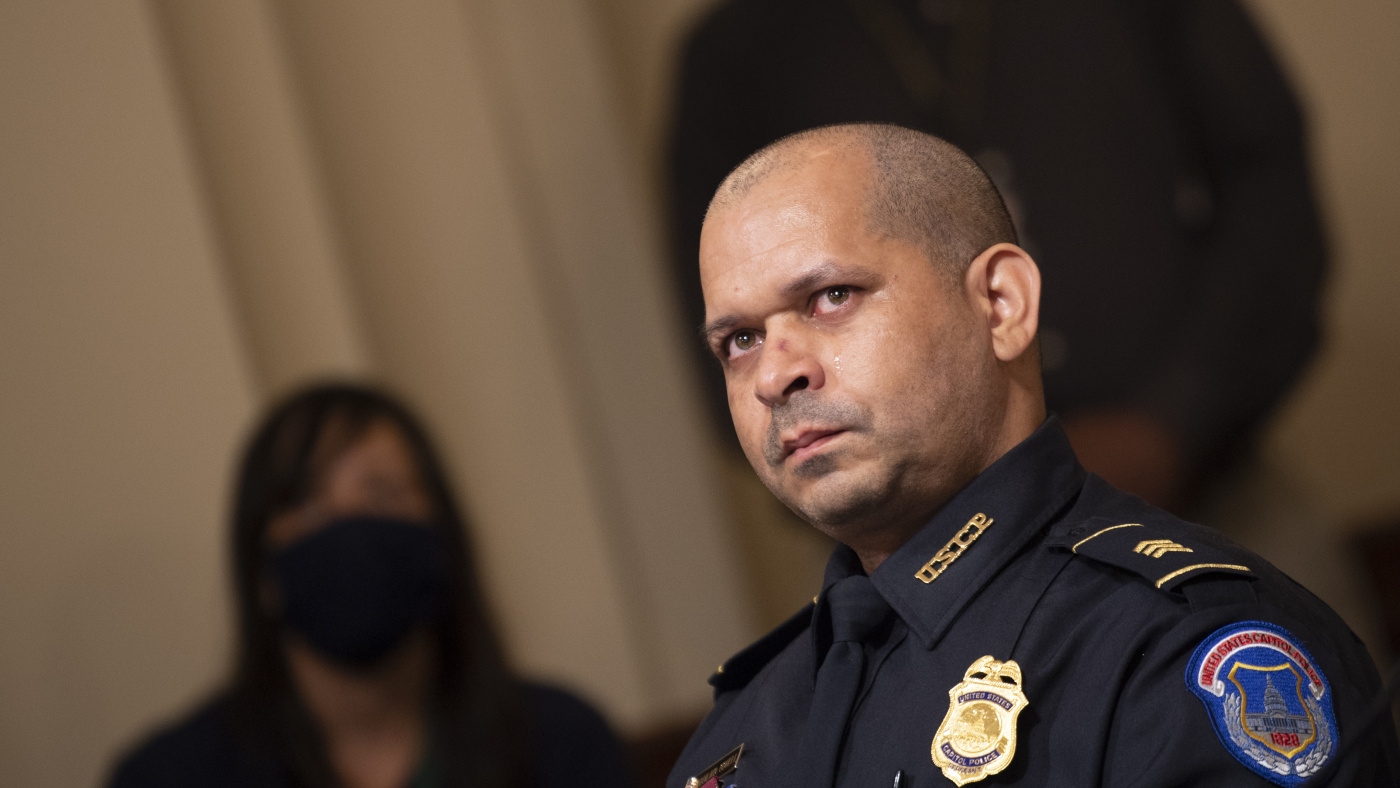 Capitol Police Sgt. Aquilino Gonell tears up during a hearing of the House select committee investigating the Jan. 6 attack on the U.S. Capitol.