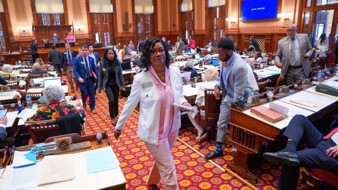 Democratic lawmakers, led by Minority Leader Carolyn Hugley, walk out of the Georgia House of Representatives last month, skipping a vote on a bill to ban gender-affirming care for inmates in state prisons.