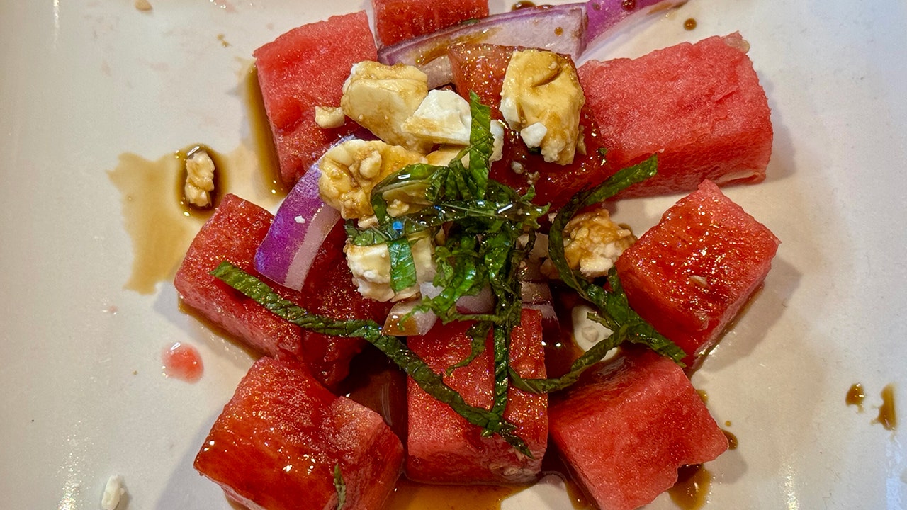 Cooper’s watermelon salad uses watermelon water -free cubes, chopped red onions, feta cheese, fresh mint and old balm vinegar. (Josh Cooper)
