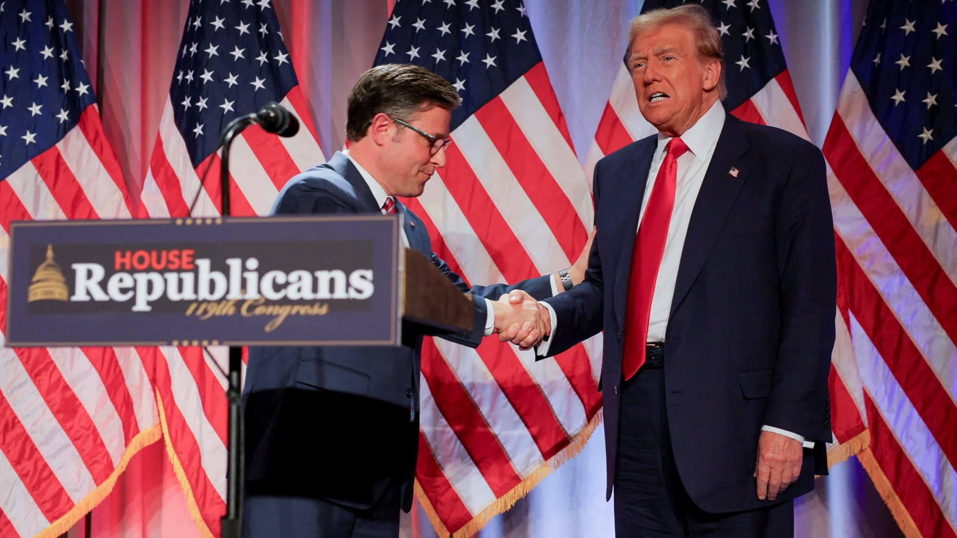 US President-elect Donald Trump shakes hands with US House Speaker Mike Johnson (R-LA) as he meets with House Republicans on Capitol Hill in Washington, US, on November 13, 2024.