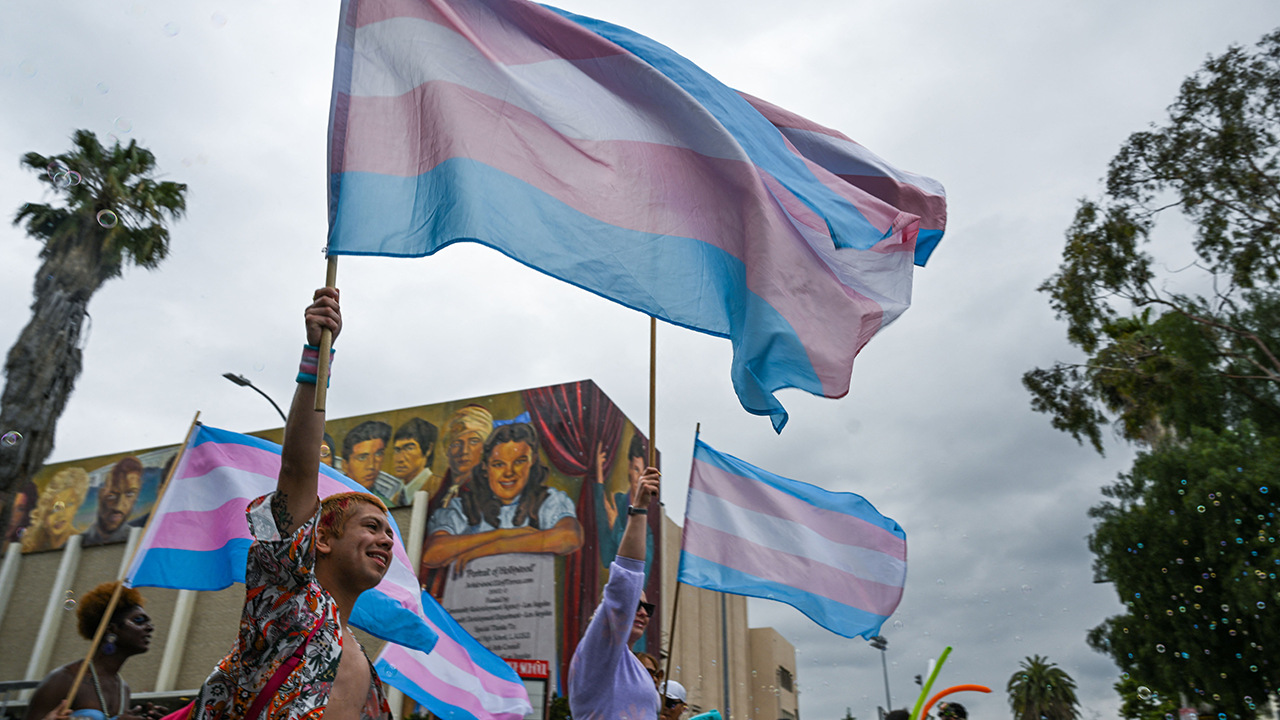 People wave the transgender pride flag at the 2023 LA Pride Parade on June 11, 2023 in Hollywood, California. (Robyn Beck/AFP via Getty Images)