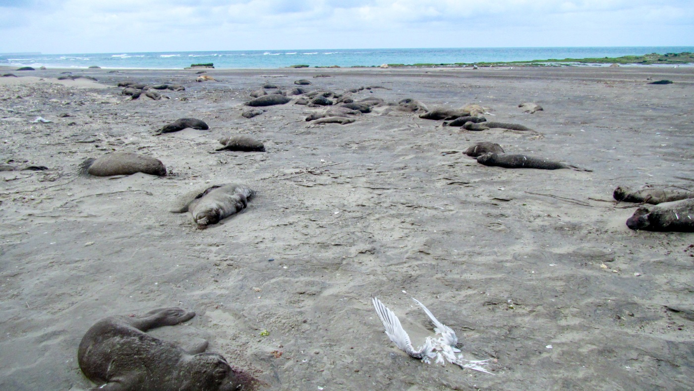 Deceased elephant seal pups line the beach at Punta Delgada in Chabut, Argentina, along with a bird carcass. Cause of death: bird flu.