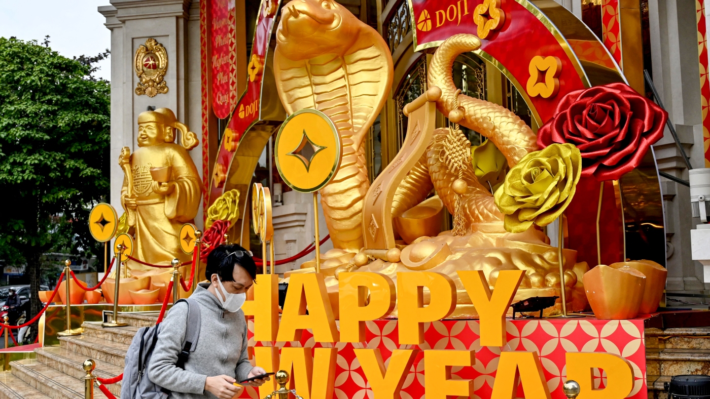 A man walks past snake decorations displayed ahead of the upcoming Chinese New Year, marking the Year of the Snake, in Hanoi on January 15, 2025. (Photo by Nhac NGUYEN / AFP) (Photo by NHAC NGUYEN/AFP via Getty Images)