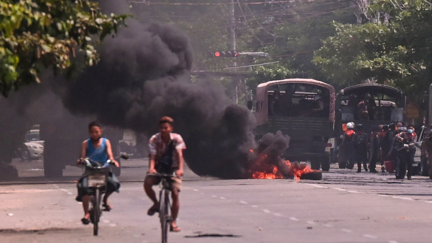 Cyclists pass police standing next to a burning makeshift tyre barricade, erected by protesters demonstrating against the military coup, in Yangon’s South Okkalapa township on April 1, 2021.
