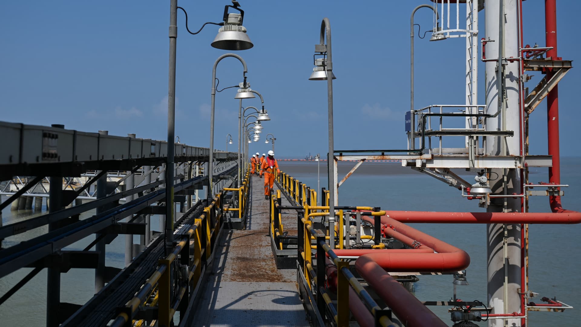 Workers walk on the jetty’s platform in dhhra lnd limited (dltpl) close to Dhamma of India of India. (Pics from puning Paranjpe / AFP) (photo from Punit Paranjpa / AF Via Getty pictures)