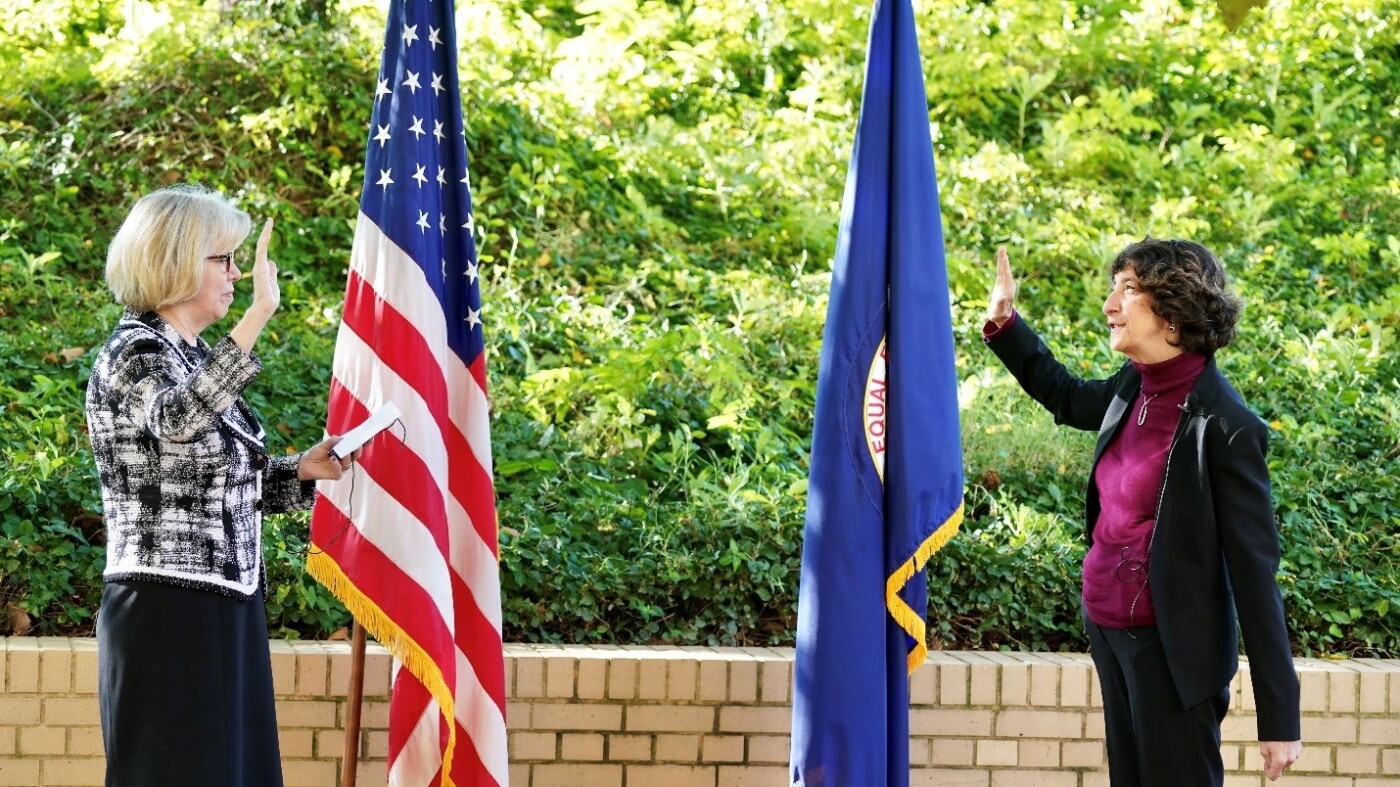 Former EEOC Commissioner Jocelyn Samuels, shown at right, President Trump’s pick in his first term to fill a Democratic seat on the commission, is sworn in by then-EEOC Chair Janet Dhillon, left, on October 14, 2020.